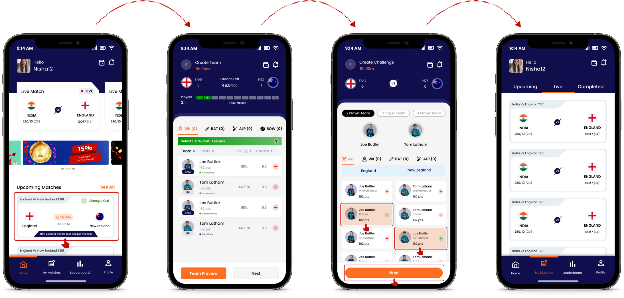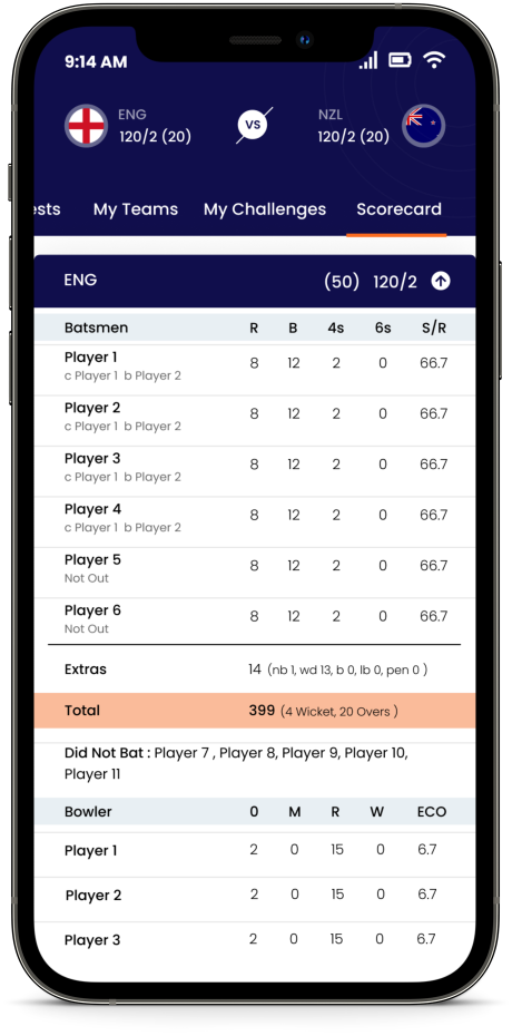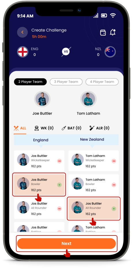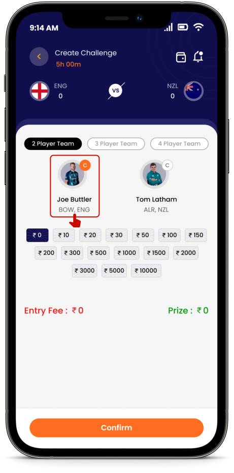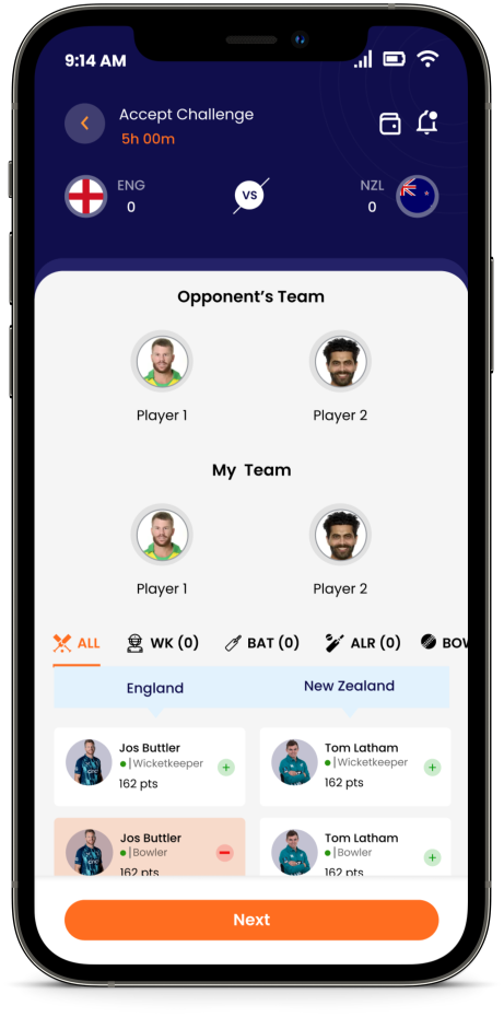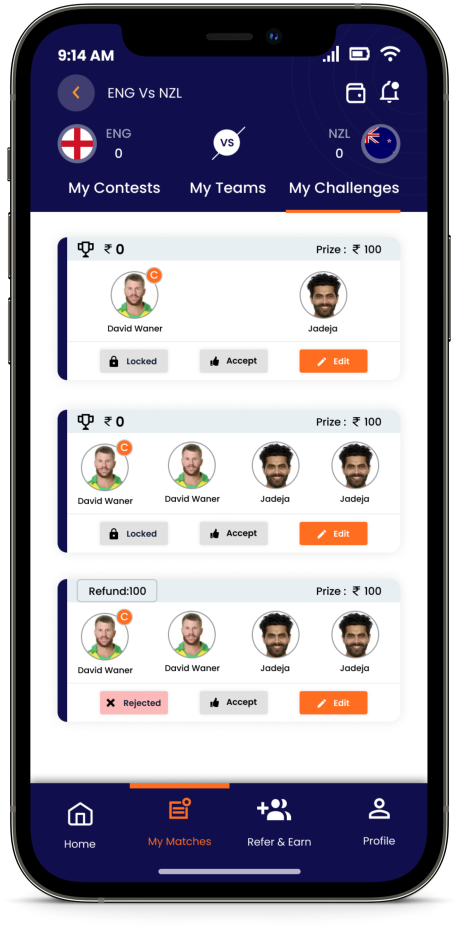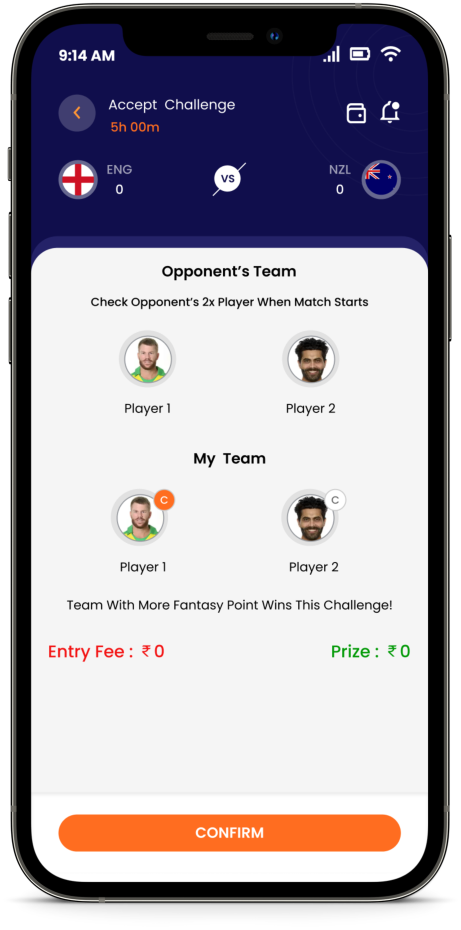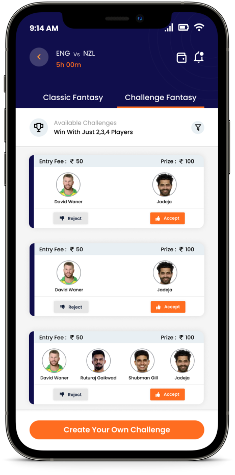 Fantasy gaming is even more fun and easier when you play with h2h fantasy. Simply choose a team of 2, 3 or 4 players from any of the upcoming match, create your own challenge and decide the challenge amount. If you are accepting an already created challenge, you need to match the challenge amount and then create your own Fantasy Team. (Pictures Below)