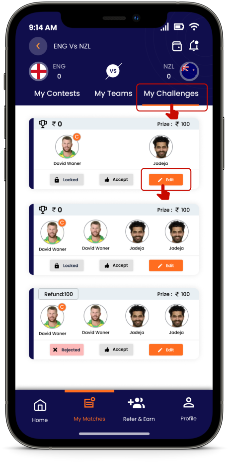 Yes, you can make changes to your Team and edit the selected players before the match starts. You make unlimited changes to your team. To edit your teams, go to “MY CHALLENGES” tab and select the challenge for which you want to Edit your team and click on the “Edit” button highlighted in blue colour.